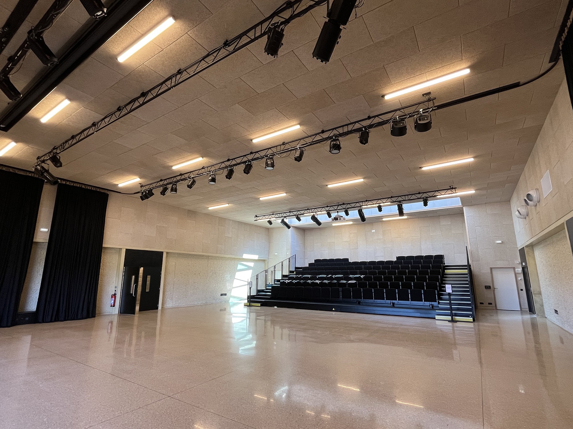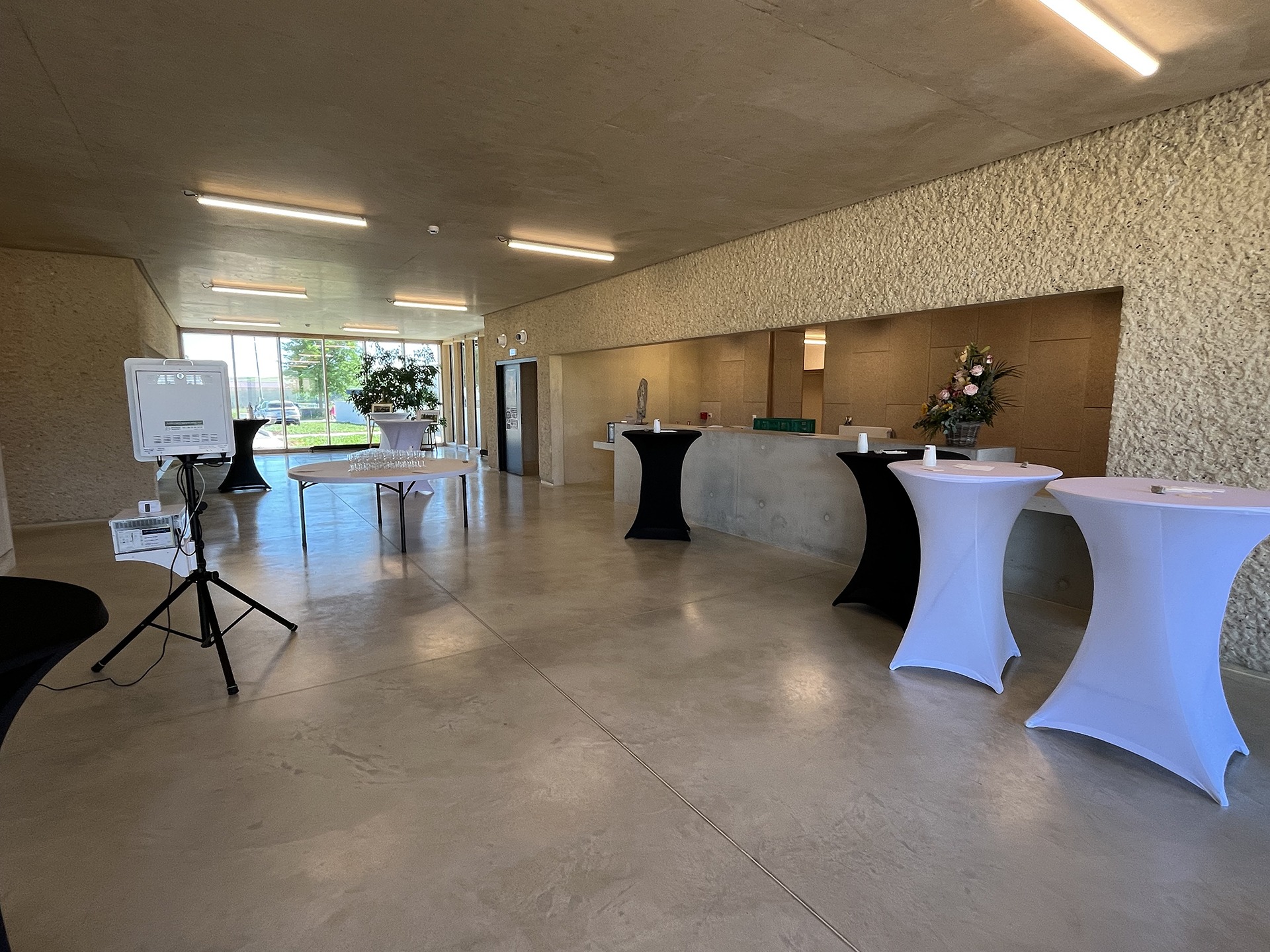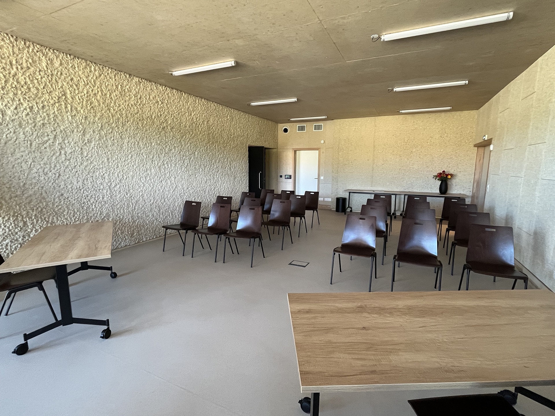 Unique en son genre, adaptable, le bâtiment bas, à l’esprit brut et minéral, comprend une grande salle polyvalente de plus de 300 m2 pouvant se transformer en salle de spectacle (tribunes rétractables), un hall, un accueil-vestiaire, un bar, deux salles annexes (salles de séminaire, loges…), des espaces de stockage, un office de réchauffage… « Construire un équipement culturel qui accueille du public est une chance, pour nous architectes, car c’est l’occasion de penser un projet pour le territoire, souligne Marc Botineau (CAB architectes). Nous nous sommes posé la question de savoir quelle identité nous pouvions donner à ce projet. Nous nous sommes attachés à essayer d’évoquer la structure des sous-sols du Kimméridgien en nous rapprochant au maximum de cette texture, de cette teinte. » Les espaces extérieurs seront aménagés à l’automne. Les travaux ont été réalisés par des entreprises locales (30 km).